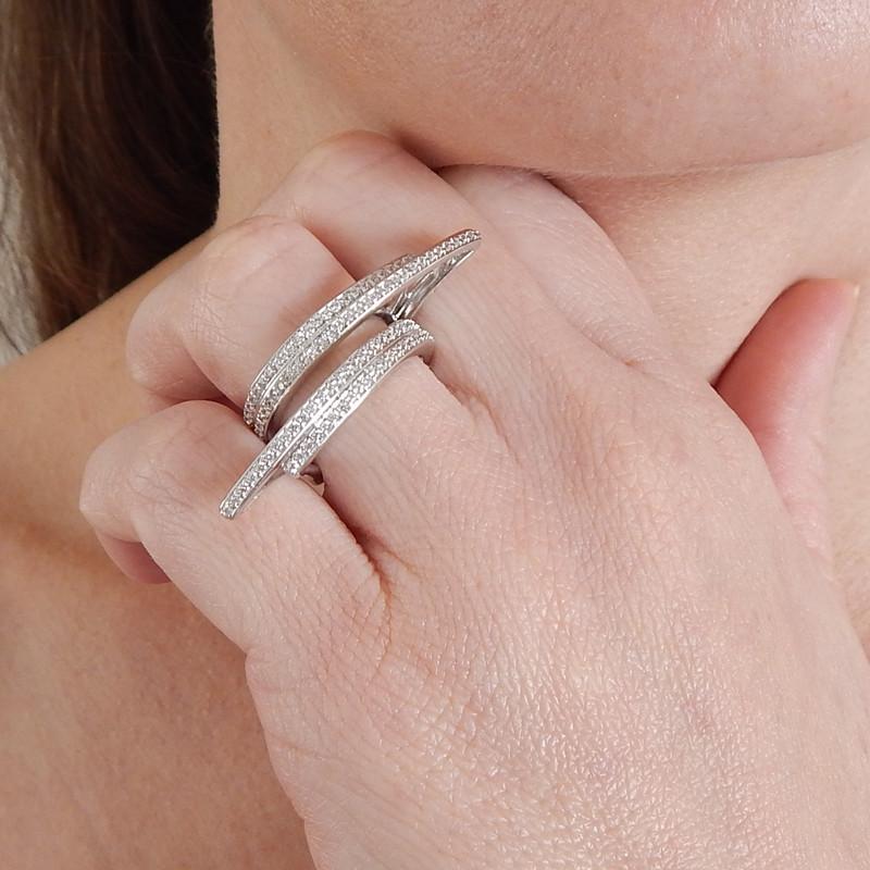 Anel semi joia banho ródio. Aliança fio duplo com extensão diagonal cravejada.