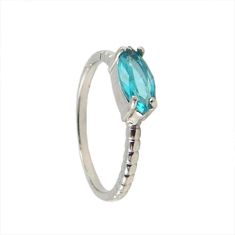 Anel semi joia banho ródio. Aliança finíssima, laterais trabalhadas, solitário em navete de cristal cores.