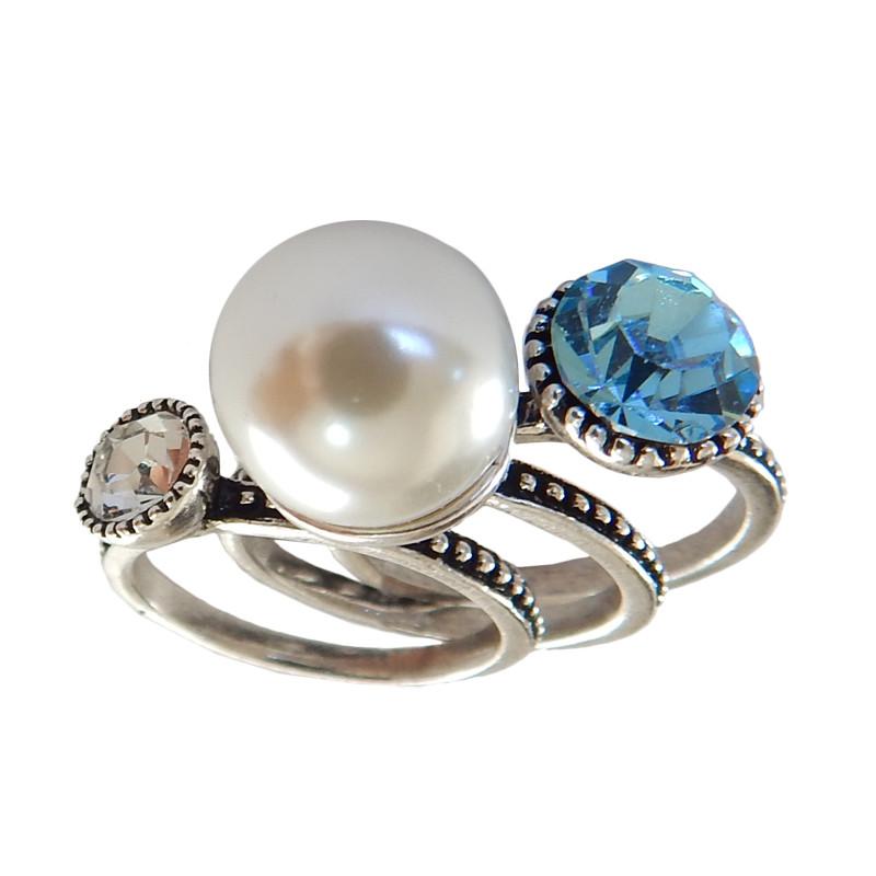 Anel semi joia banho de prata. Trio de alianças granitadas: 1 solitário de cristal acqua, 1 solitário de cristal translúcido e 1 solitário de pérola sintética 10mm.
