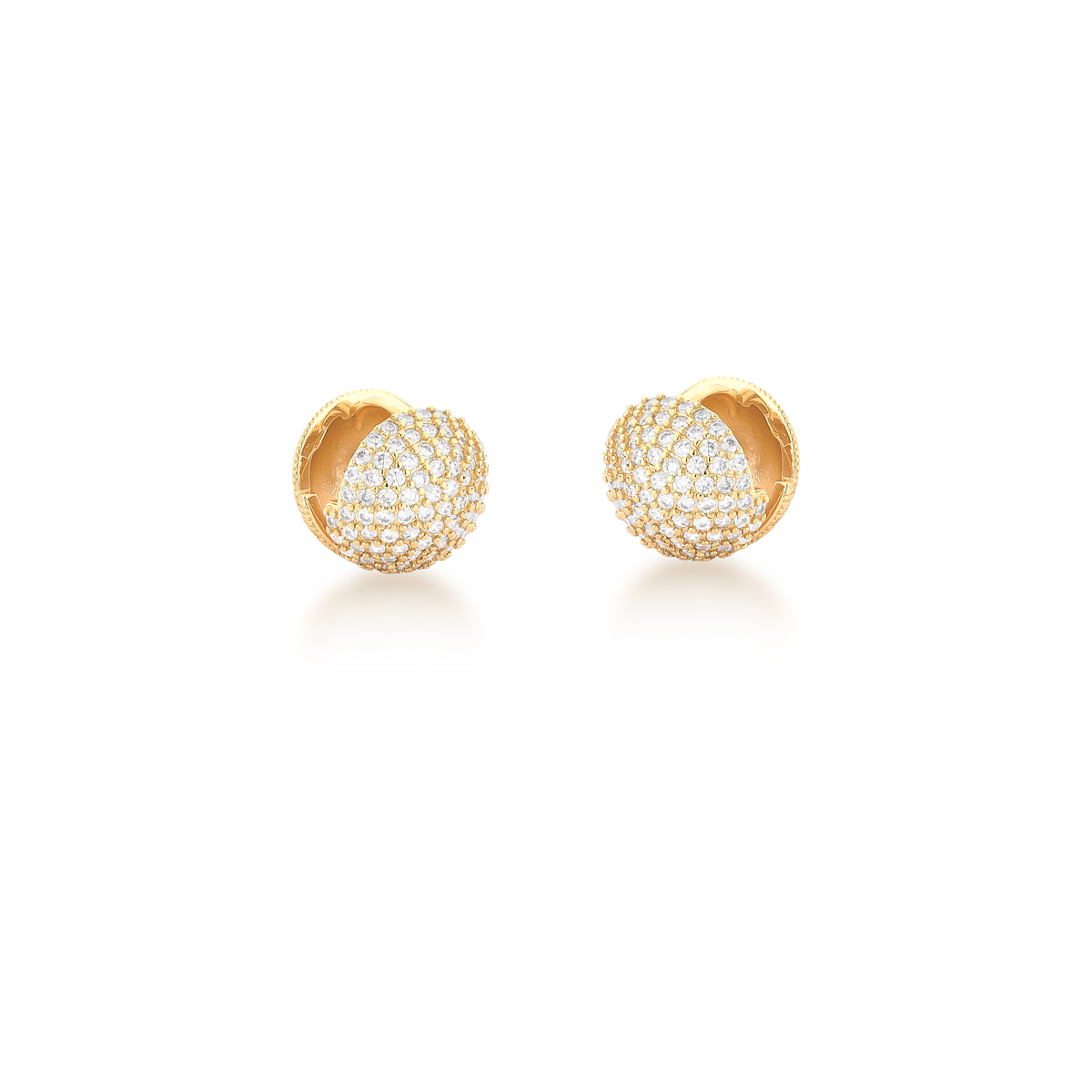 Brinco semijoia banho ouro 18k. Argola inteira, fecho clique, formato bola, frente toda cravejada com zircônias e verso granitado. Niquel free