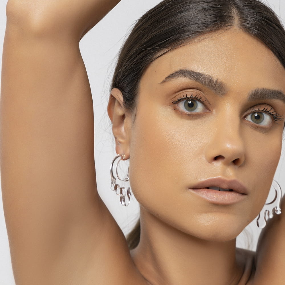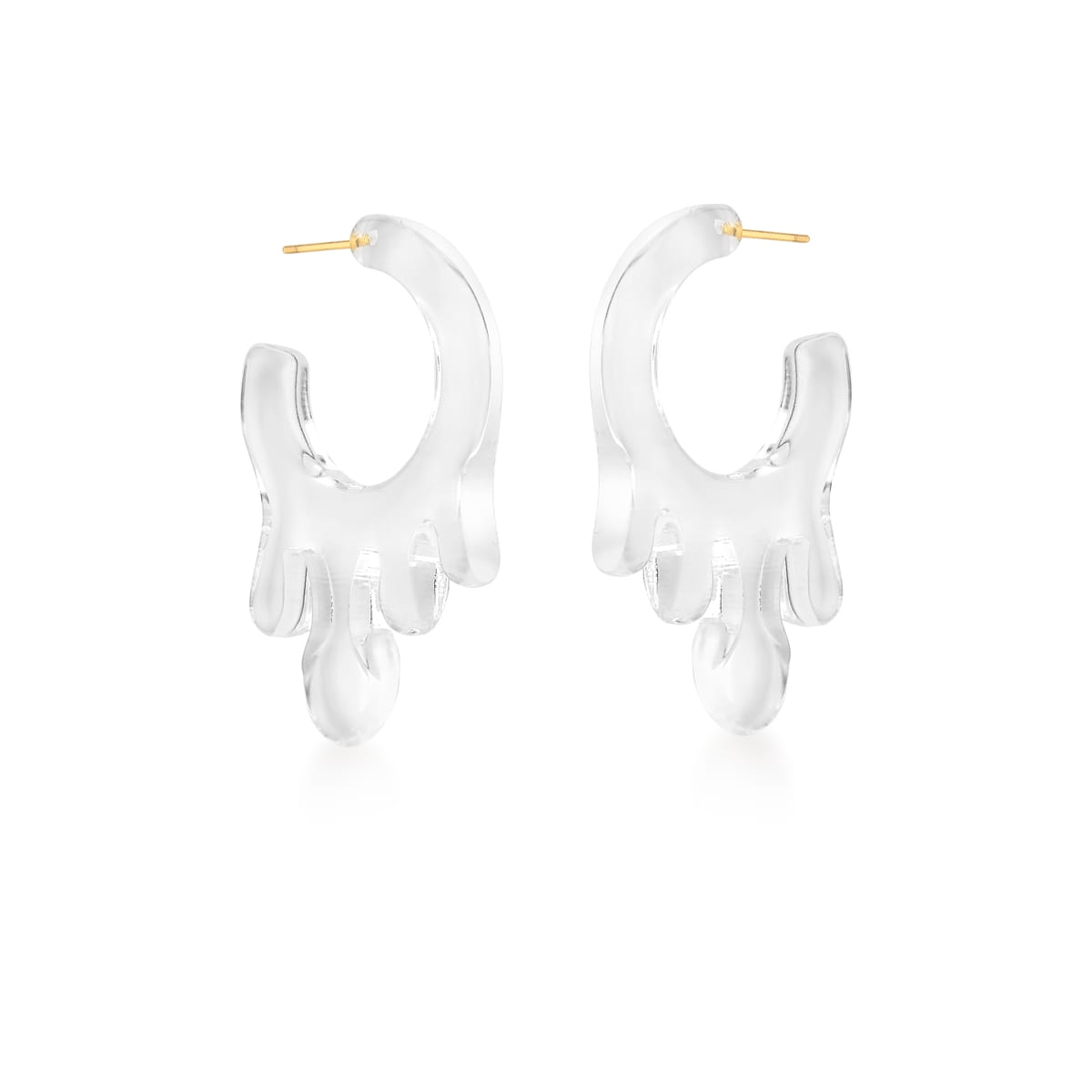 Brinco em acrílico transparente, com pino e tarraxa semi joia banho ouro 18k. 1/2 argola com design “derretimento”.