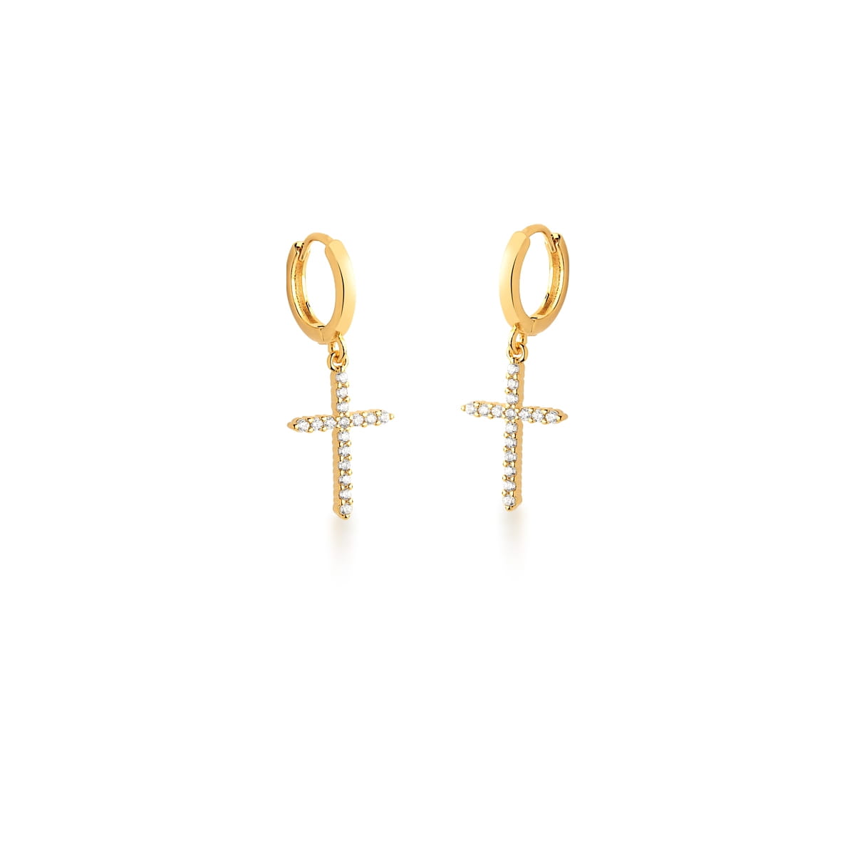 Brinco semi joia banho ouro 18k. Argola inteira, lisa, fecho clique, com pingente cruz cravejada. Niquel free