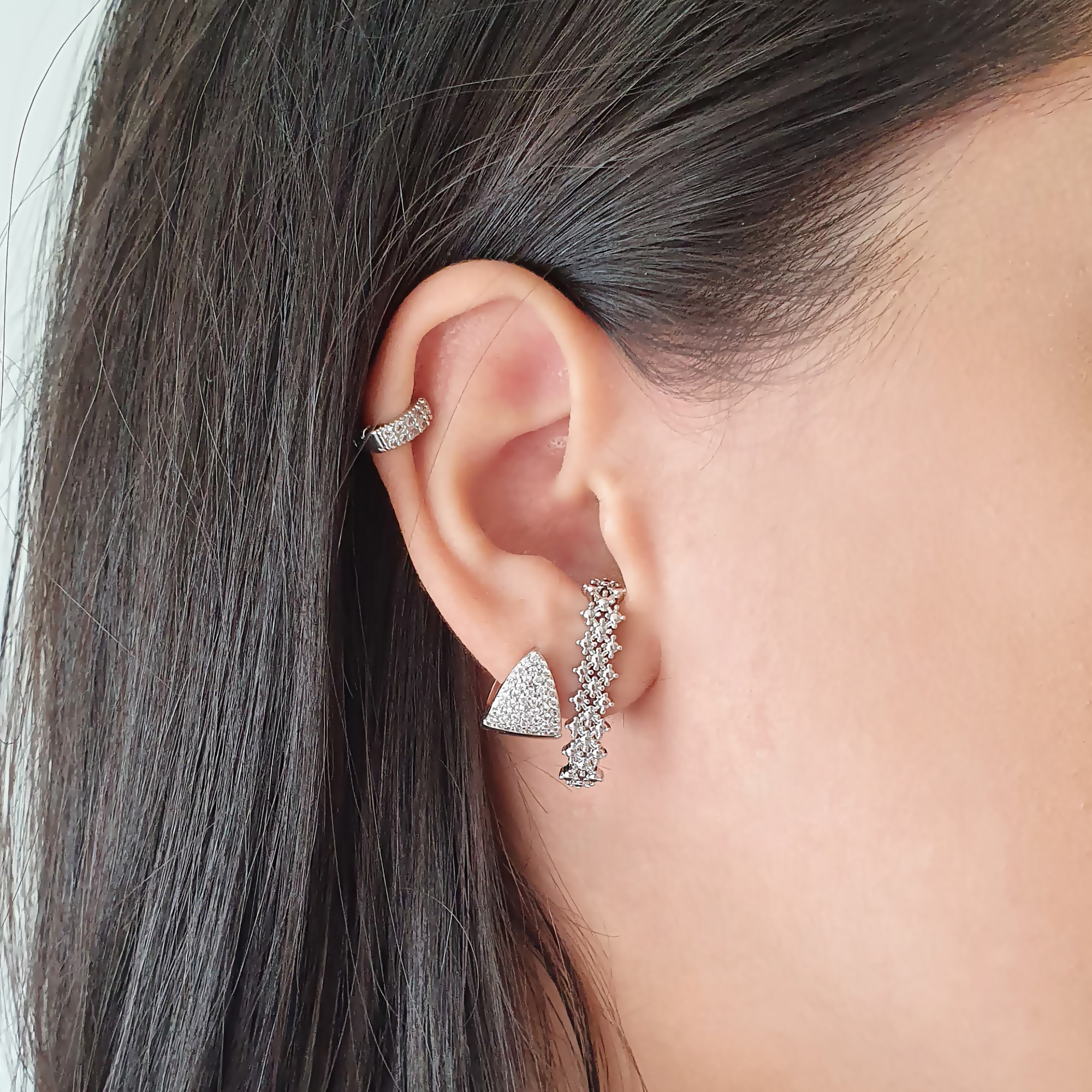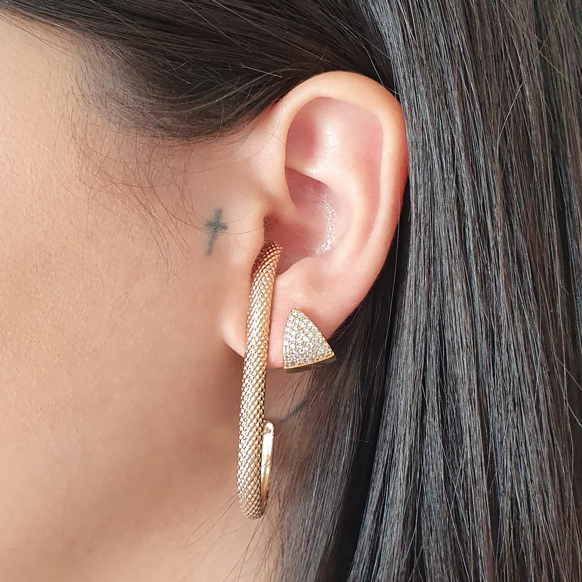 Brinco semi joia. Argola triangular, inteira, fecho clique e frente cm micro cravação.