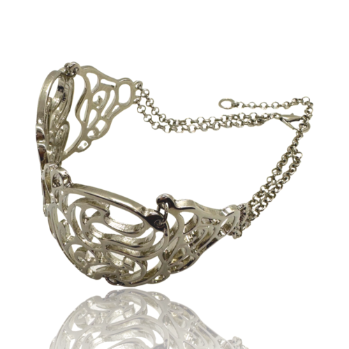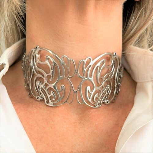 Colar bijuteria cor prateada. Choker articulada com desenho borboleta vazada e corrente elo português