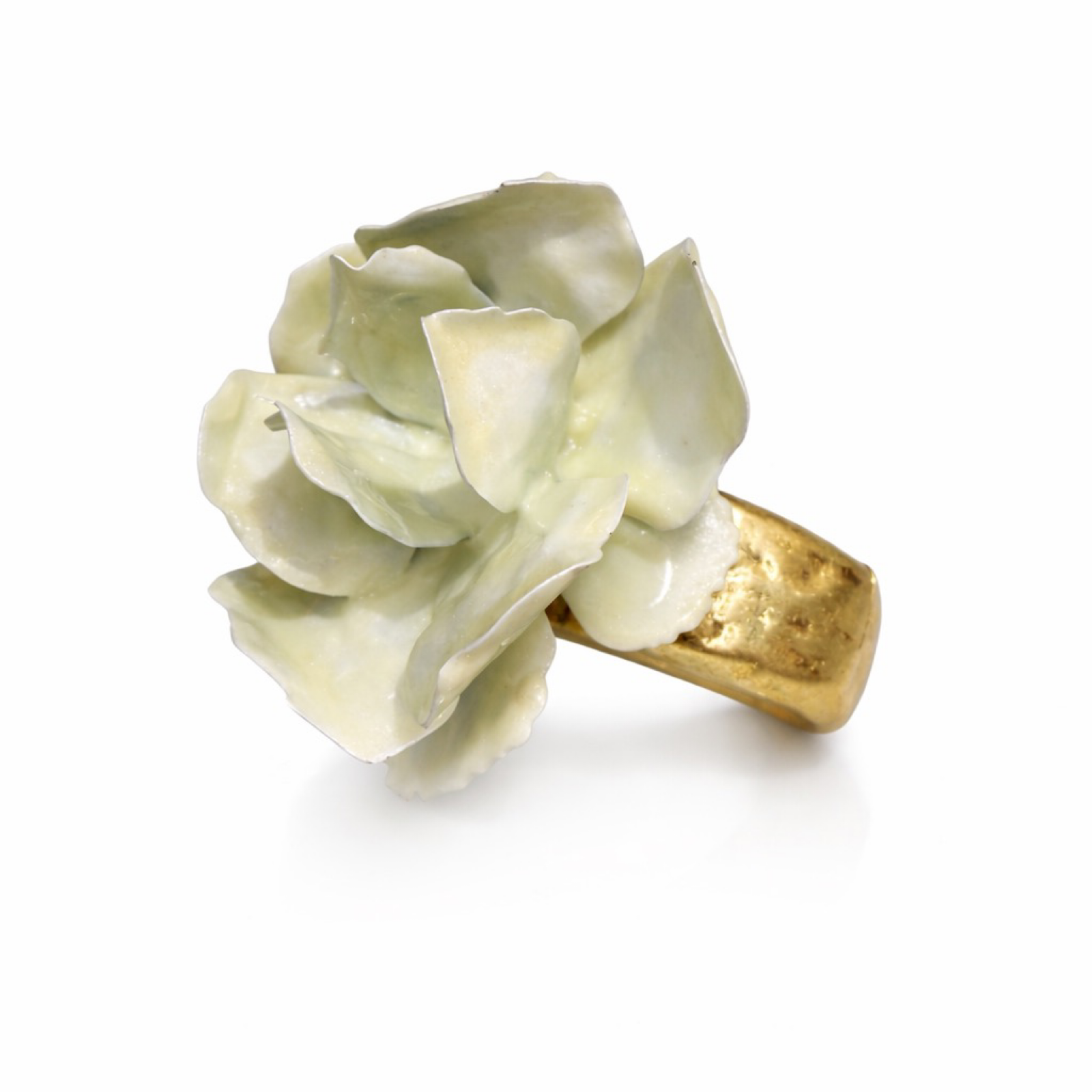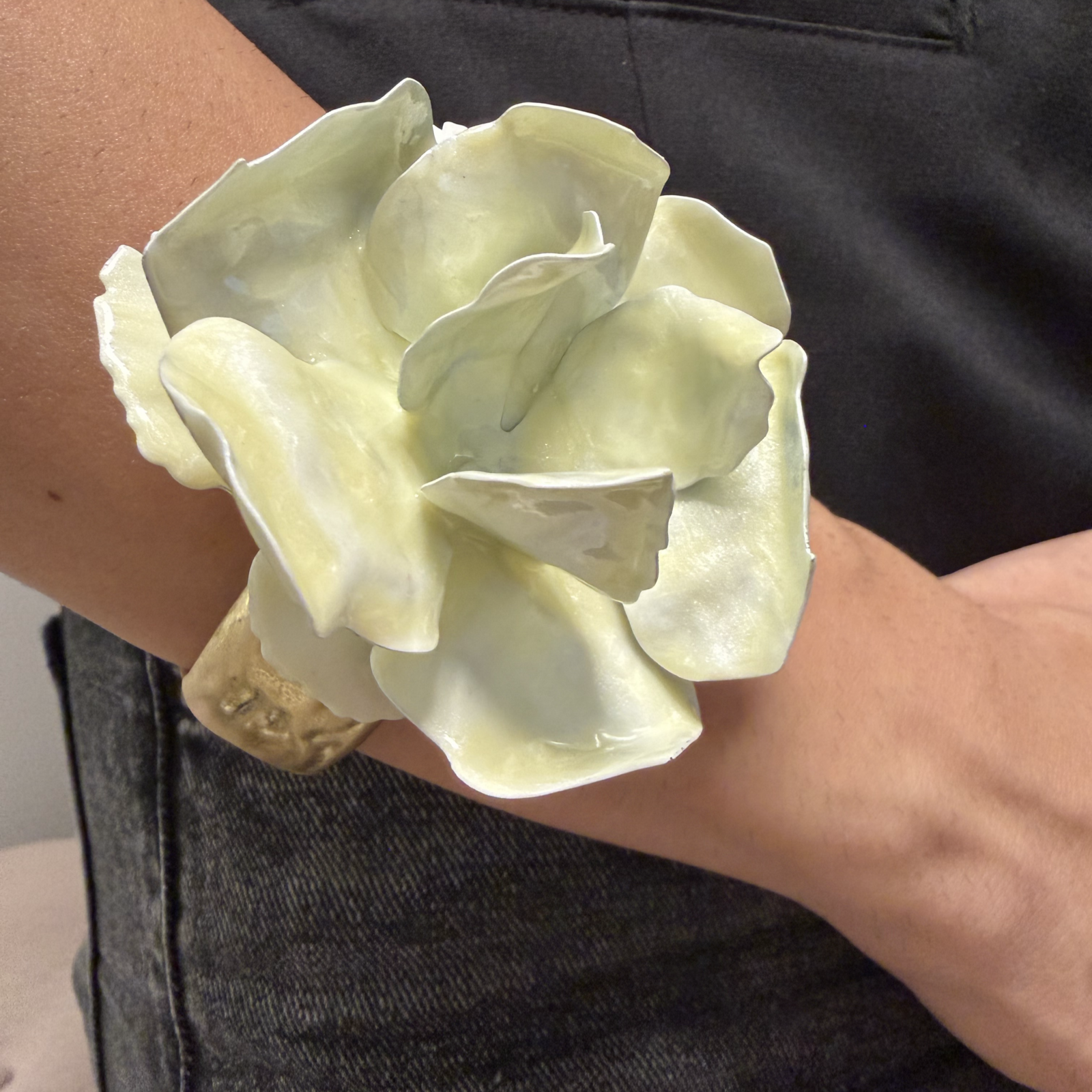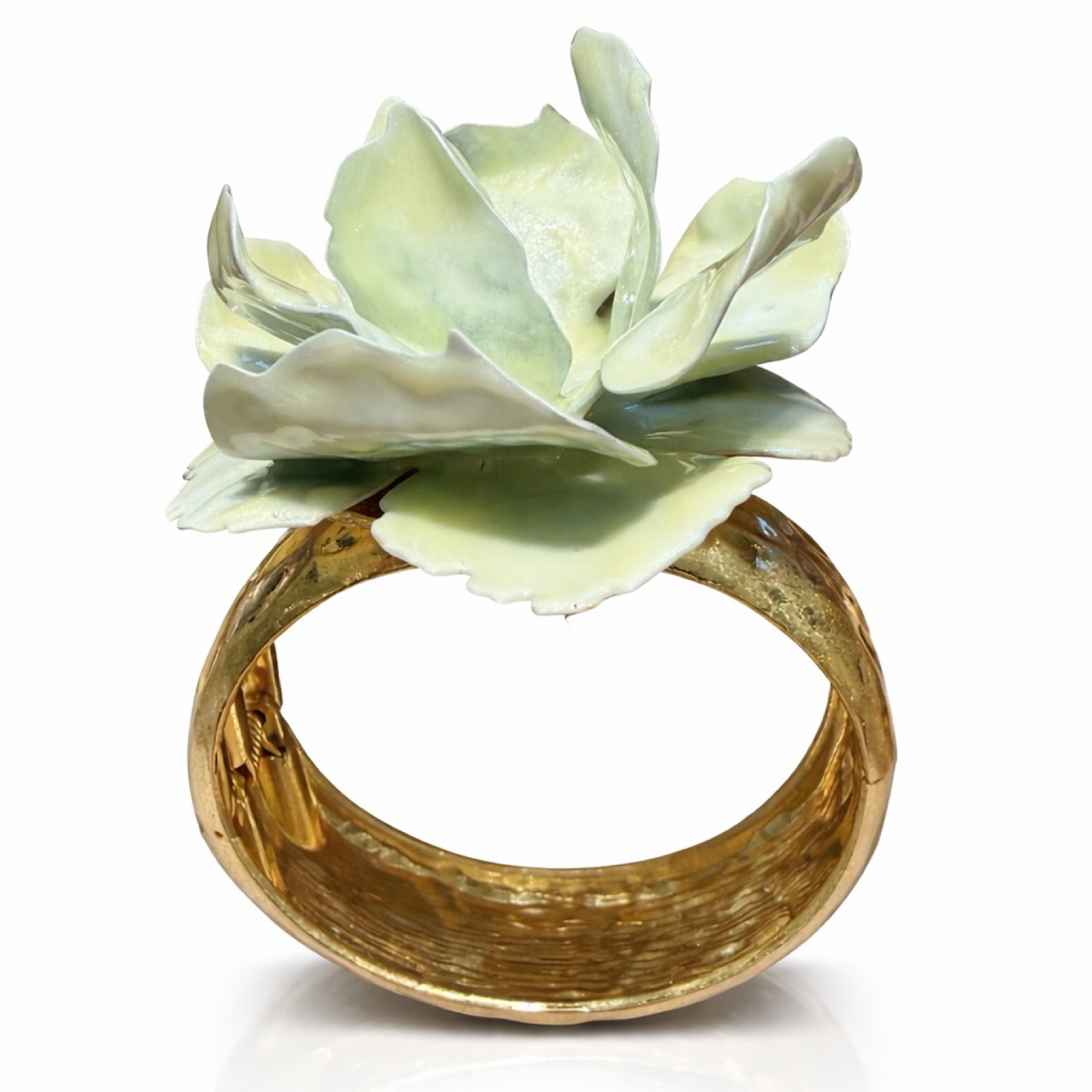Pulseira bijuteria banho verniz dourado. Modelo bracelete articulado, martelado com maxi flor em 3D esmaltada na cor branca.