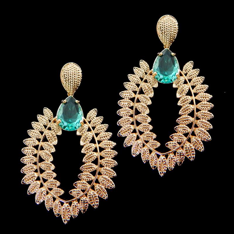 Brinco semi joia banho ouro 18k. Base gota removível. Oval vazado, todo em navetes granitadas e gota cristal facetado.
