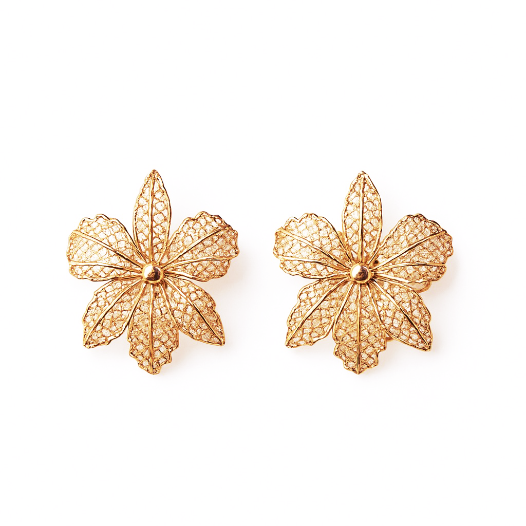 Brinco semijoia banho ouro 18k. Flor toda telada grande e levíssima. Niquel free
