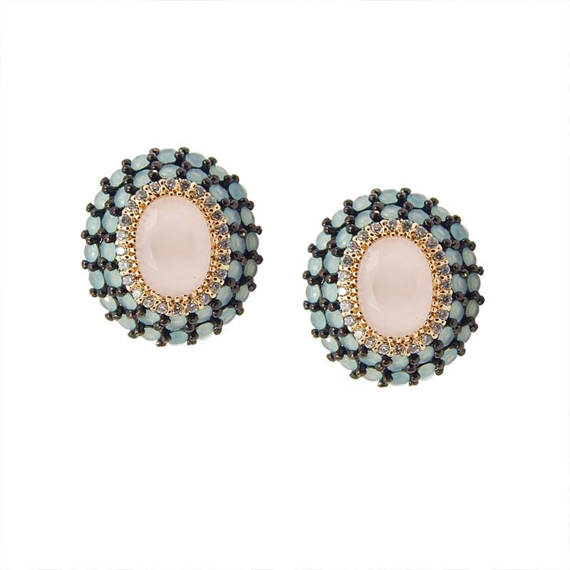 Brinco semi joia. Tipo bottom oval. Zircônia facetada centro e tripla fileira cravejada cores.