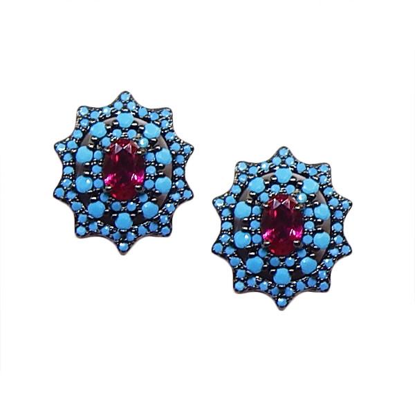 Brinco semi joia banho ródio negro. Formato oval com babados, nano turquesas e zircônia oval facetada no centro