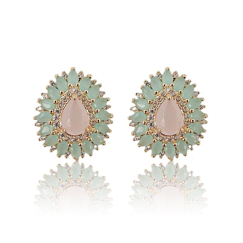 Brinco semi joia. Formato gota com centro em zircônia lapidada, contorno cravejado e externo em mini gotas também em zircônia.
