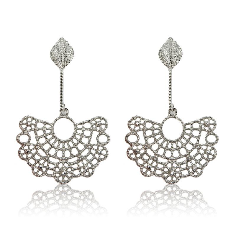Brinco semi joia banho ródio. Gota e haste granitadas. 1/2 círculo tipo leque granitado e vazado.