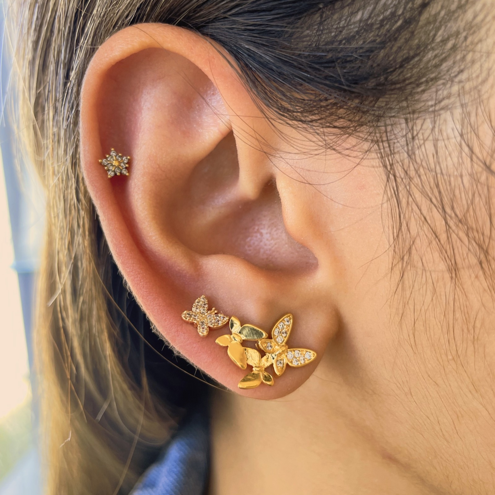 Brinco semijoia banho ouro 18k. Trio de borboletas sendo 2 mini borboletas lisas e uma cravejada. Uso adulto ou infantil. Niquel free