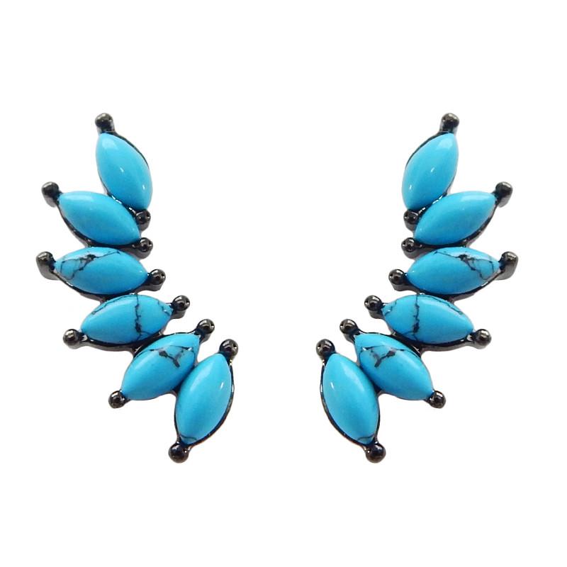 Brinco semi joia banho ródio negro. Tipo ear cuff para primeiro ou segundo furo, curvo, 6 navetes em zircônia turquesa reconstituída. Sem galeria.