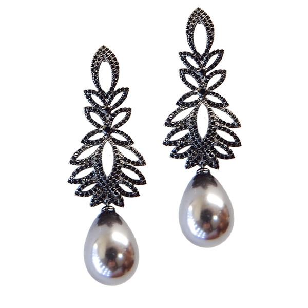 Brinco semi joia banho ródio negro. Base toda em folhas cravejadas com microzircônias negras. Pérola negra sintética formato gota.