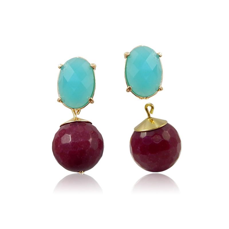 Brinco semi joia banho ouro 18k. Base oval em pedra lapidada e bola em pedra cabochão. 2 em 1. Desmontável – com gancho no verso da base.
