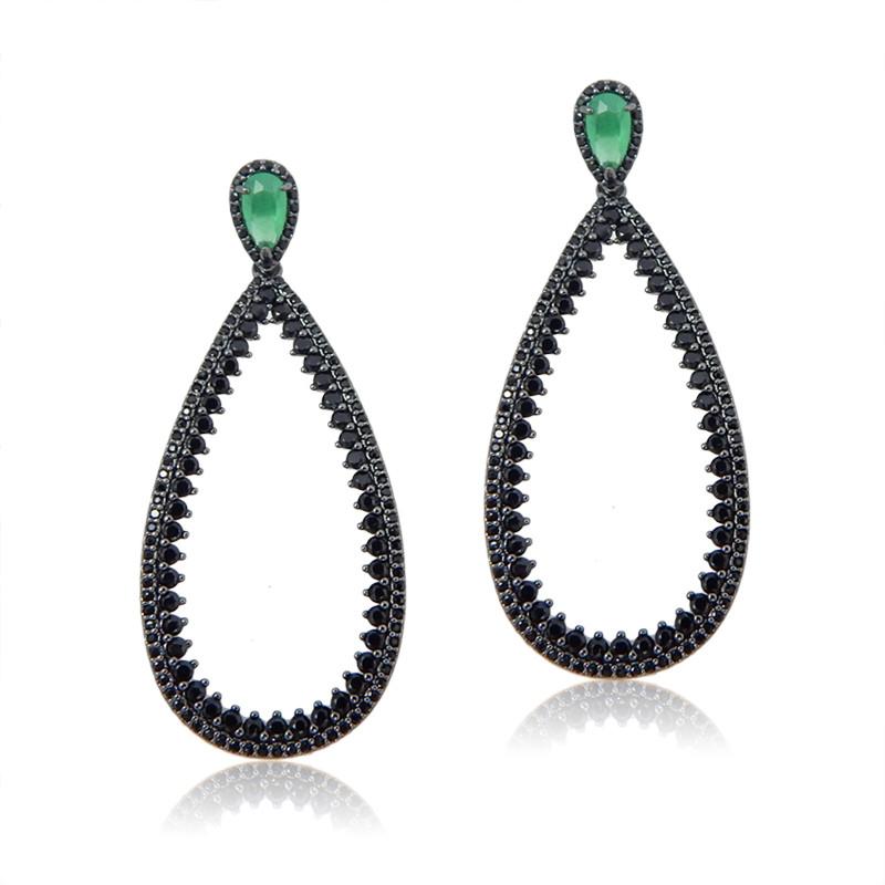Brinco semi joia banho ródio negro. Base em gota zircônia com contorno micro cravado. Gota média vazada em 2 fileiras de zircônia.