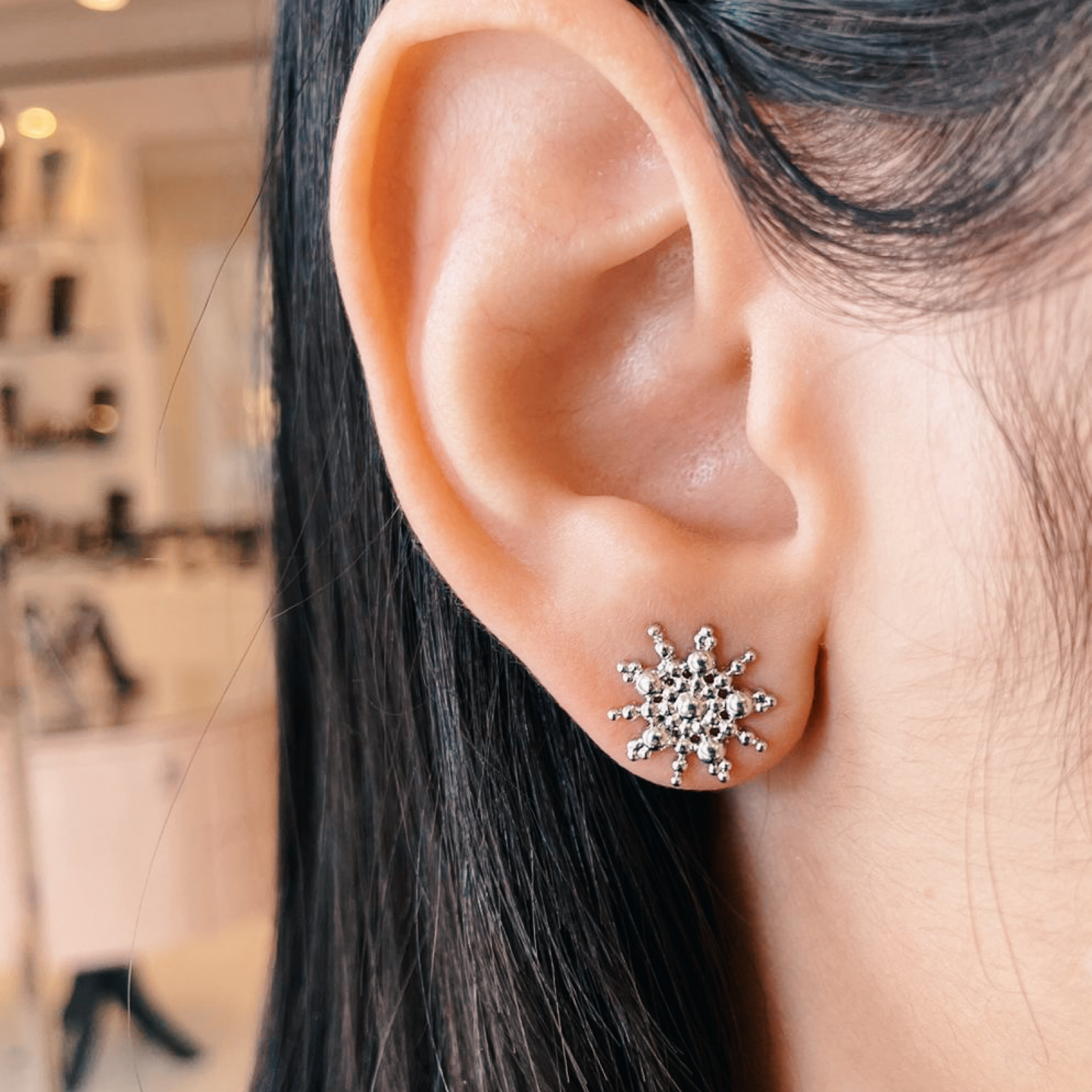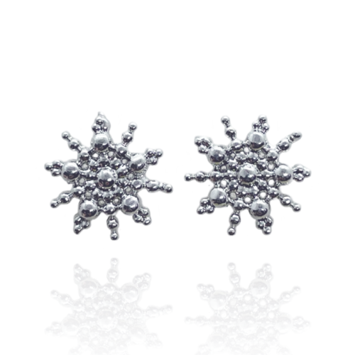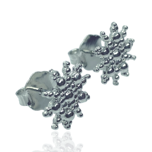 Brinco semijoia banho ródio. Bottom tipo flor, todo em bolinhas, sem cravação. Niquel free