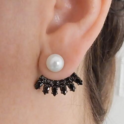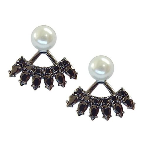 Brinco semi joia banho ródio negro. Ear jacket com base pérola sintética Arco com 6 zircônias em navetes e 6 pontos.