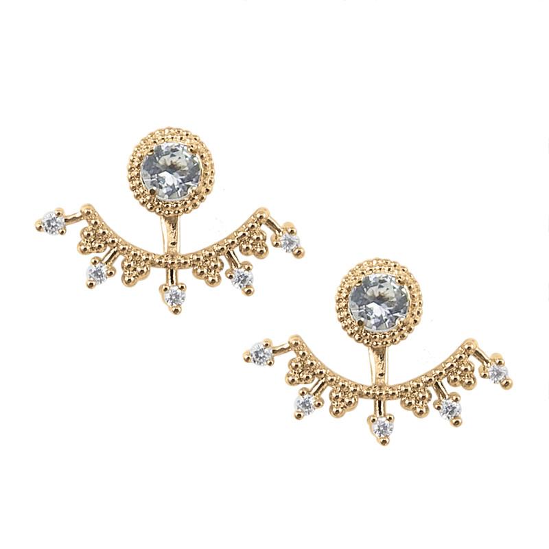Brinco semi joia banho ouro 18k. Modelo ear jacket- 2 peças. Ponto de luz redondo em zircônia. Peça inferior com 5 mini triângulos em zircônia cristal e trabalho granitado.