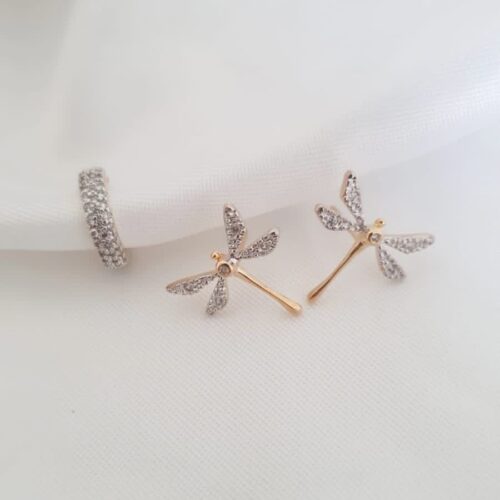 Brinco semijoia banho ouro 18k. Libélula com asas canetadas em ródio e cravejadas. Uso adulto ou infantil. Niquel free