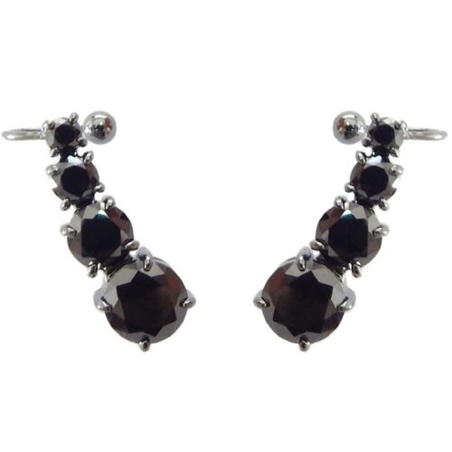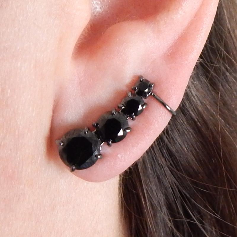 Brinco semi joia banho ródio negro. Tipo ear cuff, curvo, 4 pontos de luz em zircônia translúcida, redondos, facetados e decrescentes. Com encaixe lateral.