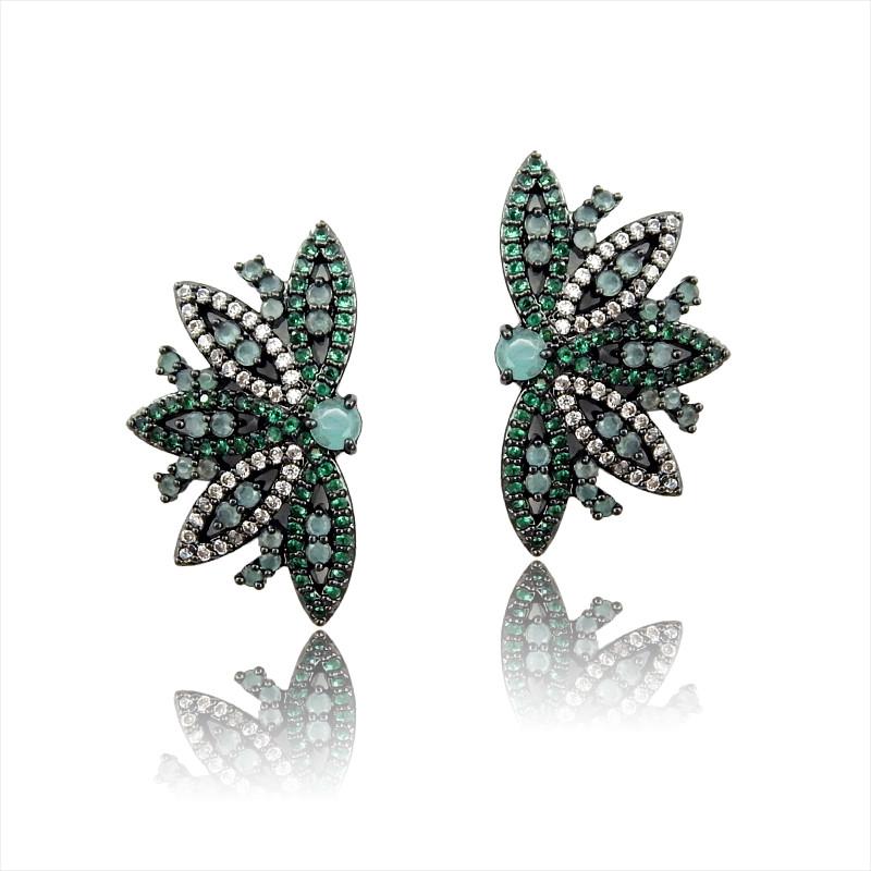 Brinco semi joia banho ródio negro. 1/2 asa com 5 navetes cravejadas e pontos. Mix de zircônias: cristal, esmeralda e acqua.