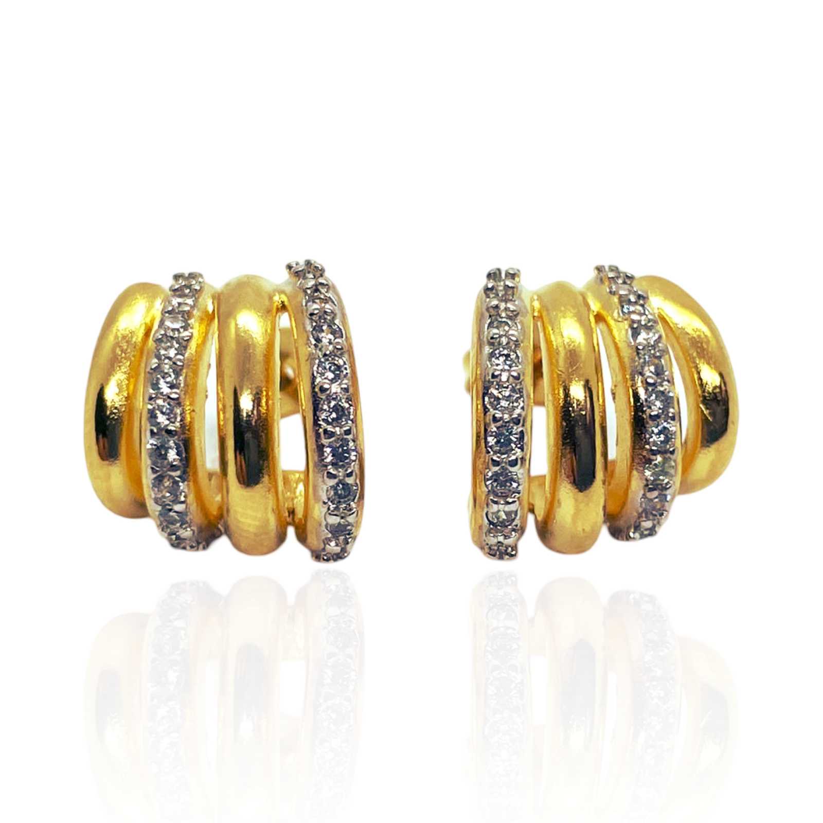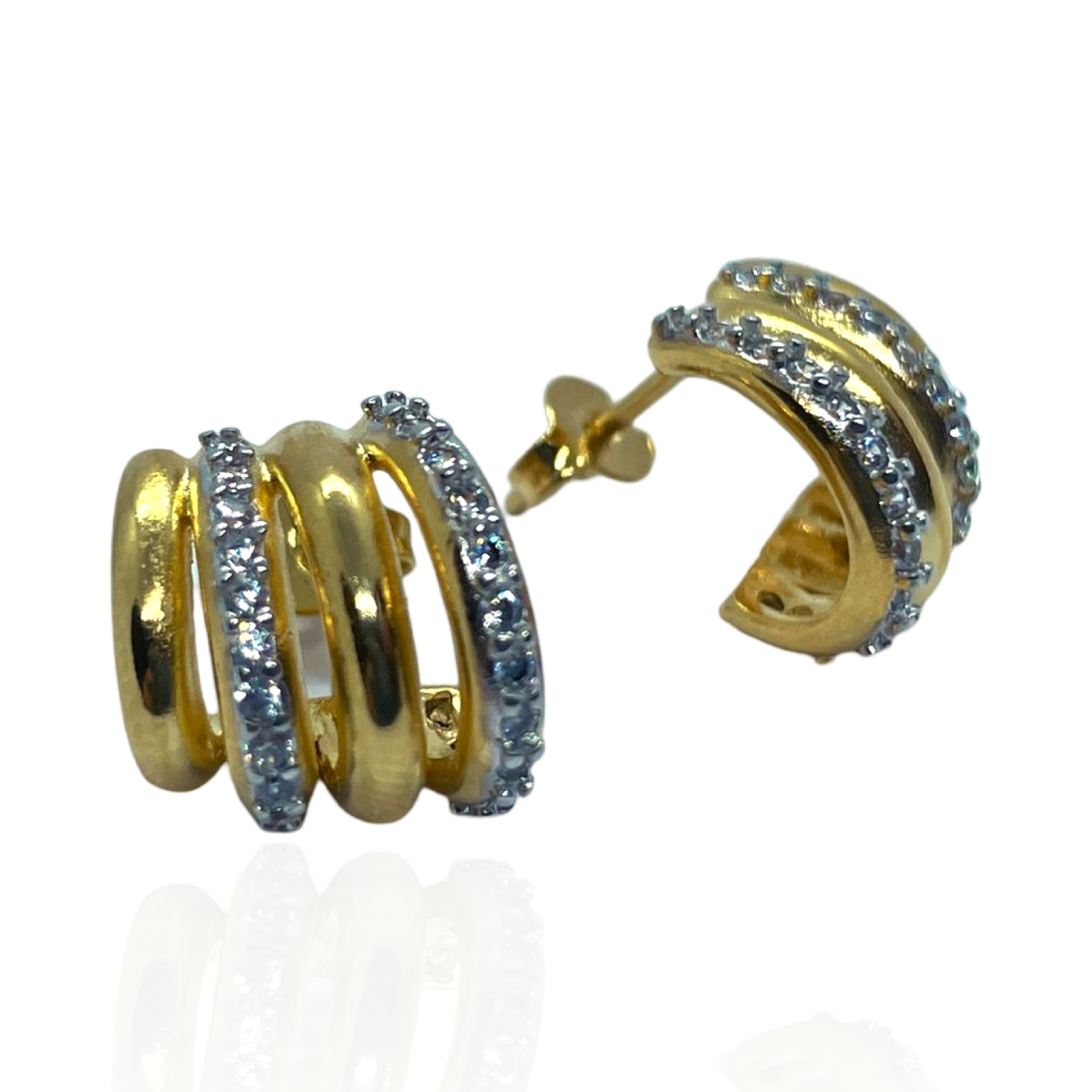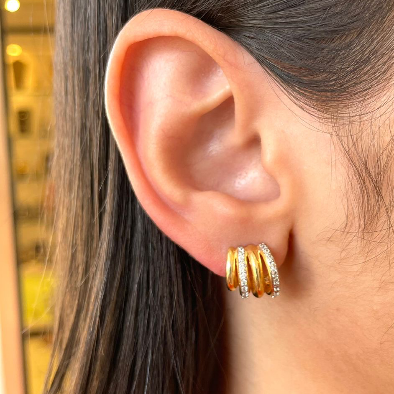 Brinco semijoia banho ouro 18k. Tipo mola, sendo 2 fios lisos e 2 canetados em ródio e cravejados. Tamanhos degradés. Niquel free