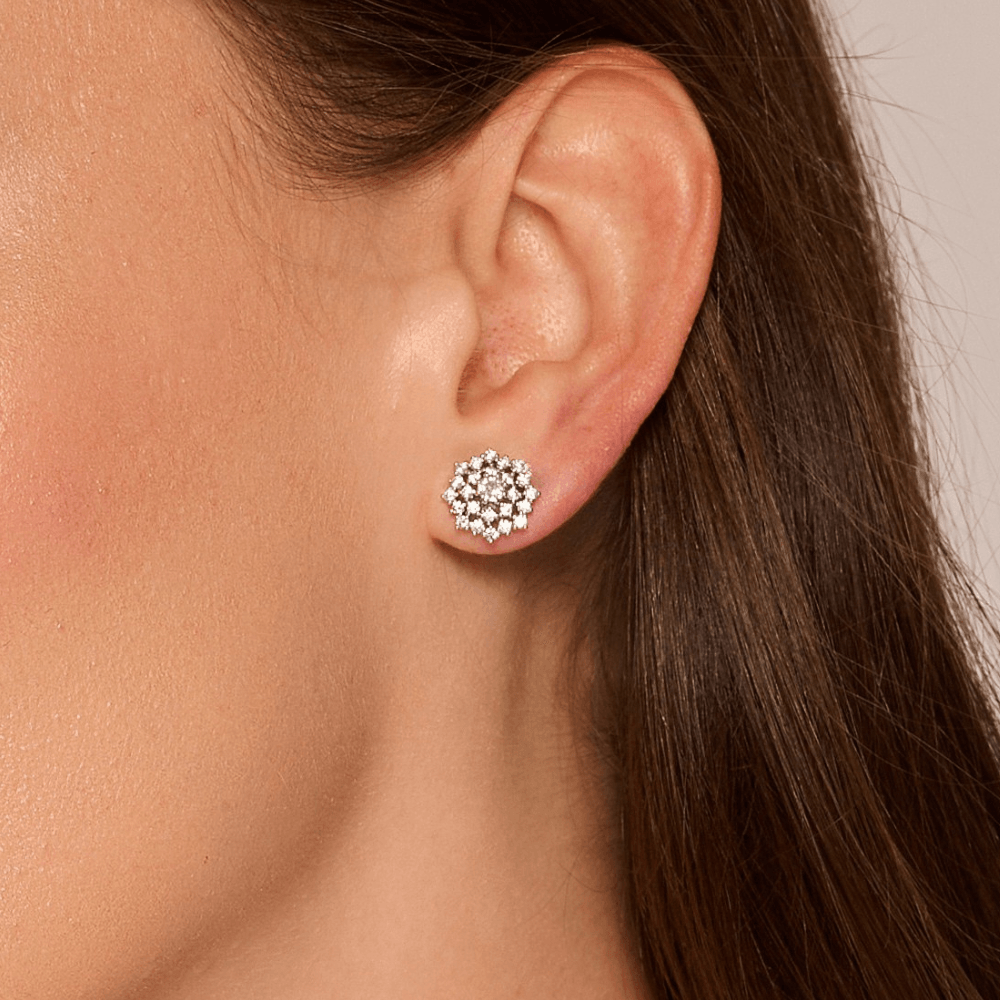 Brinco semijoia banho de ródio. Modelo chuveiro. Todo cravejado em camadas, com ponto de luz ao centro. Niquel free