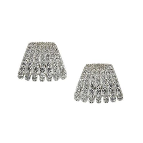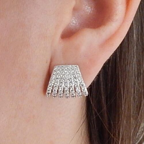 Brinco semi joia. Tipo leque, com leve curvatura e 6 fios todos cravejados em zircônia cristal.