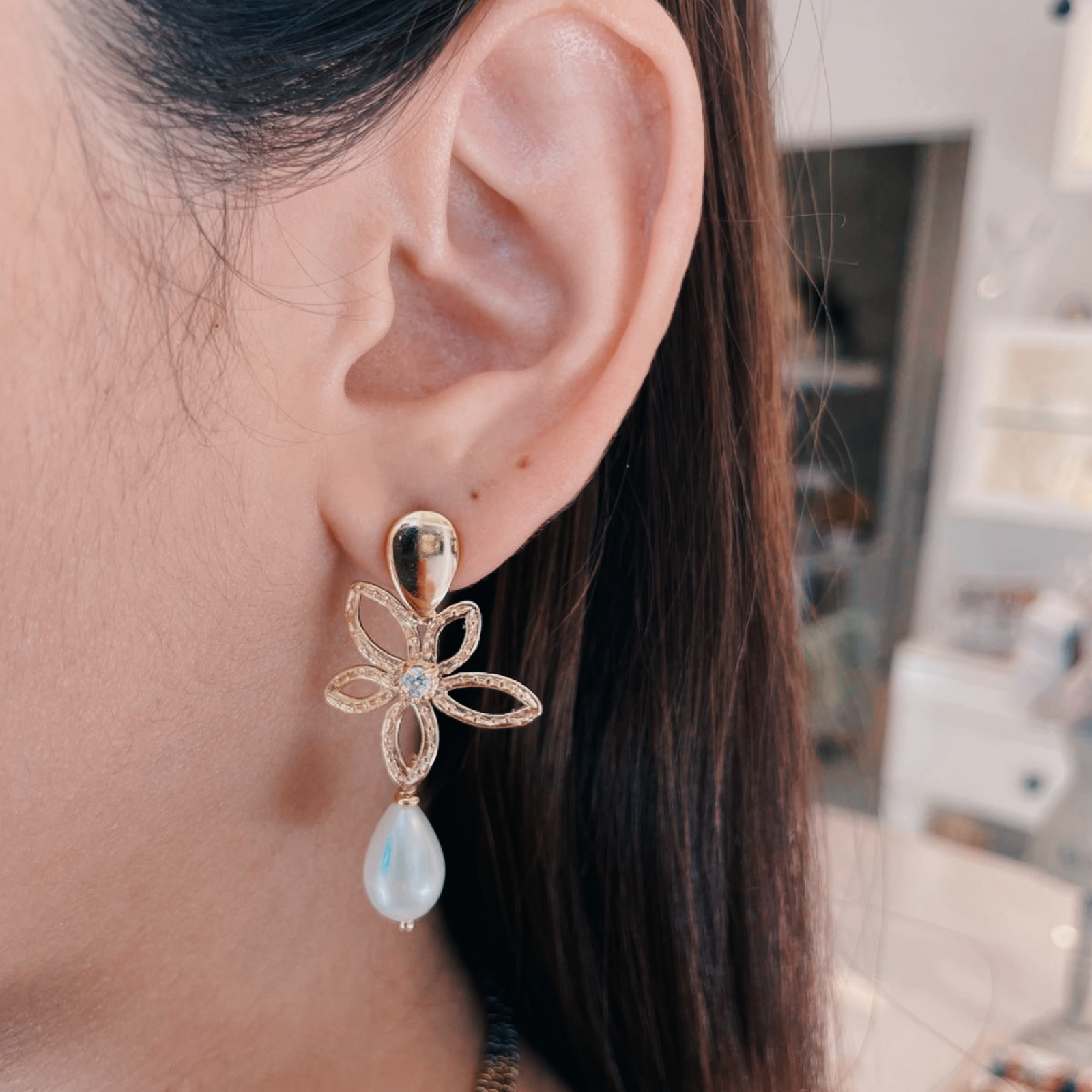 Brinco semijoia banho ouro 18k. Base flor com pétalas vazadas, 1 ponto de zircônia e pingente pérola gota. Niquel free