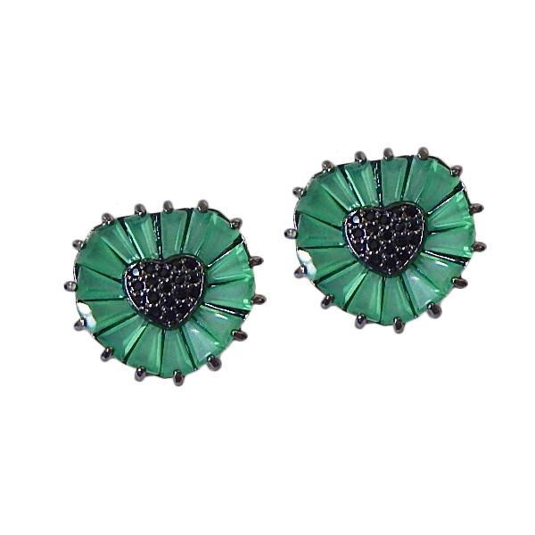 Brinco semi joia banho ródio negro. Coração todo em baguetes verde esmeralda, centro com micro zircônias negras.