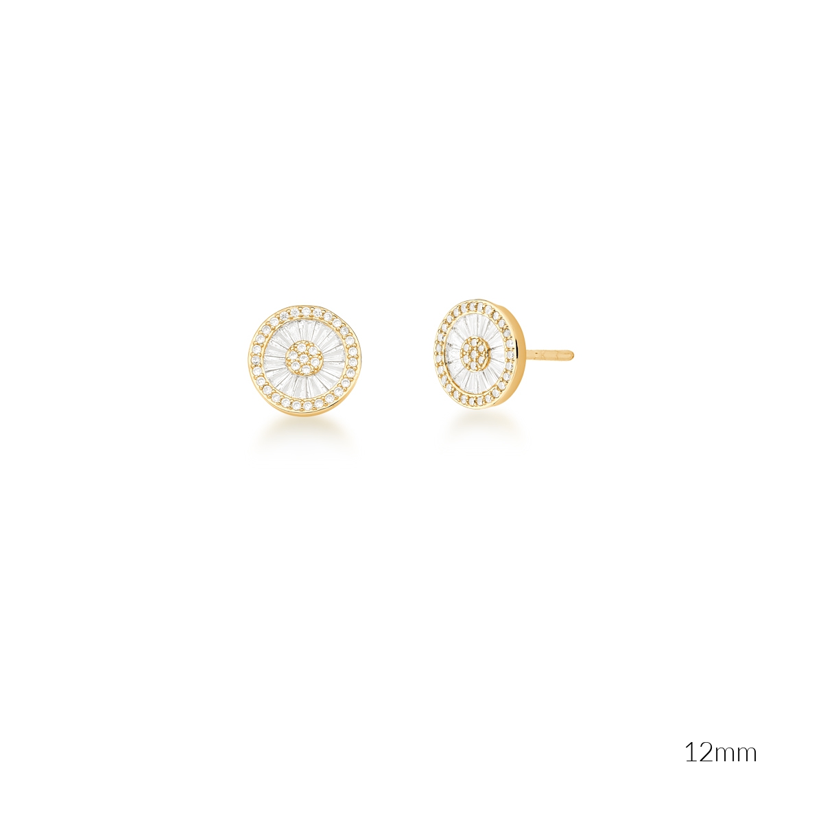 Brinco semijoia banho ouro 18k. Modelo pizza. Bottom em zircônias de baguetes, com contorno e centro cravejados. Niquel free