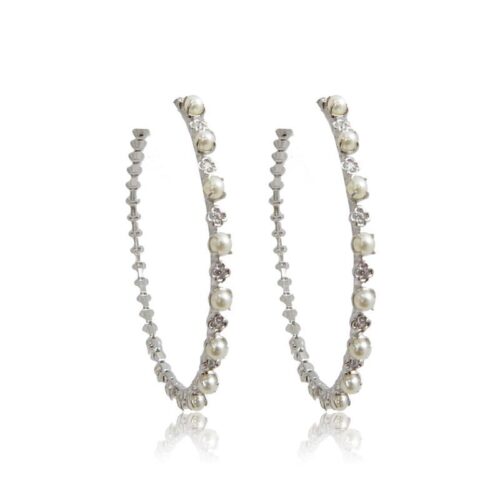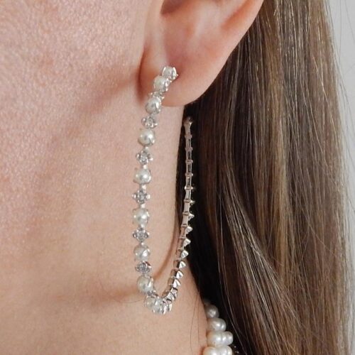 Brinco semi joia. Meia argola grande. Mini pérolas intercalada com florzinhas e zircônia cristal.