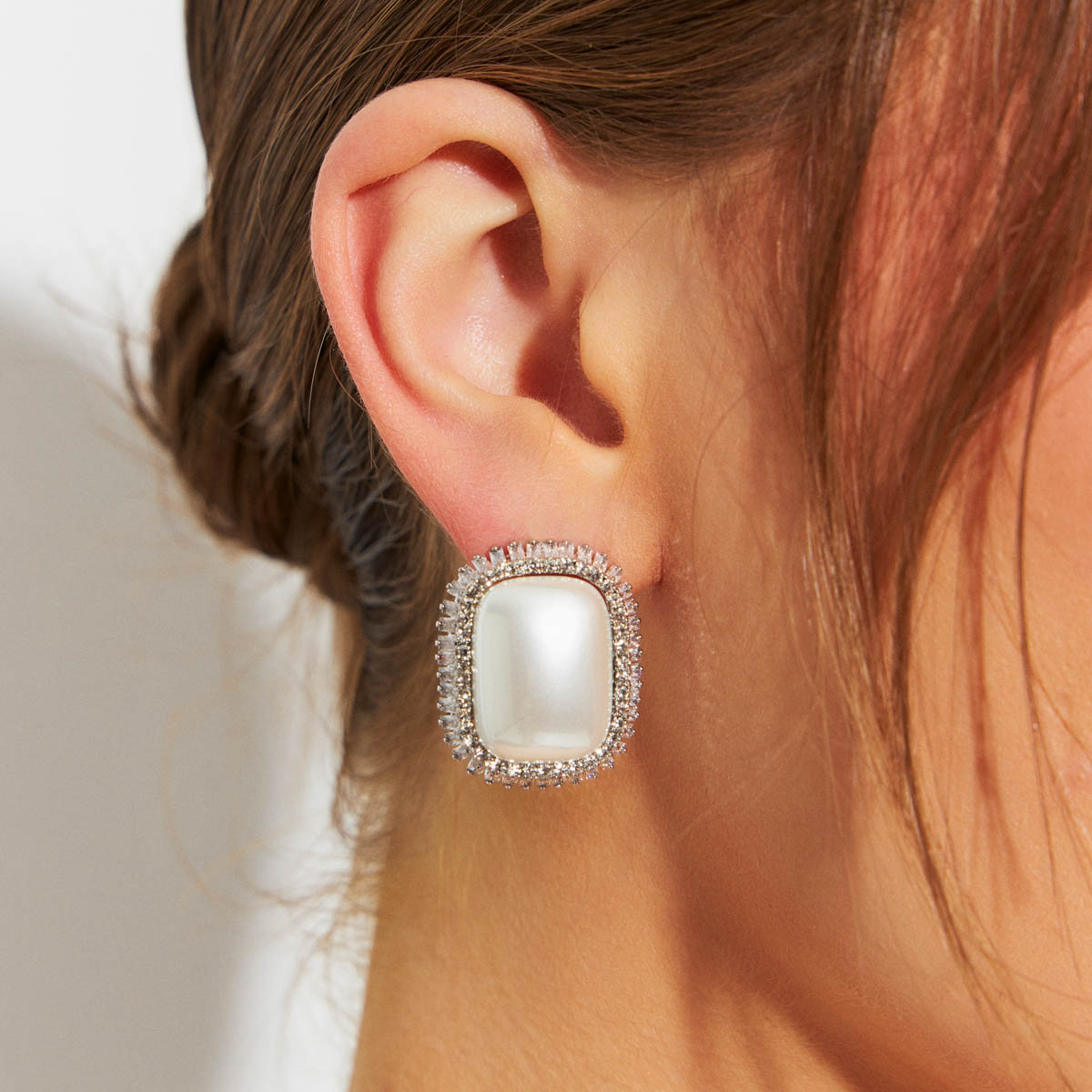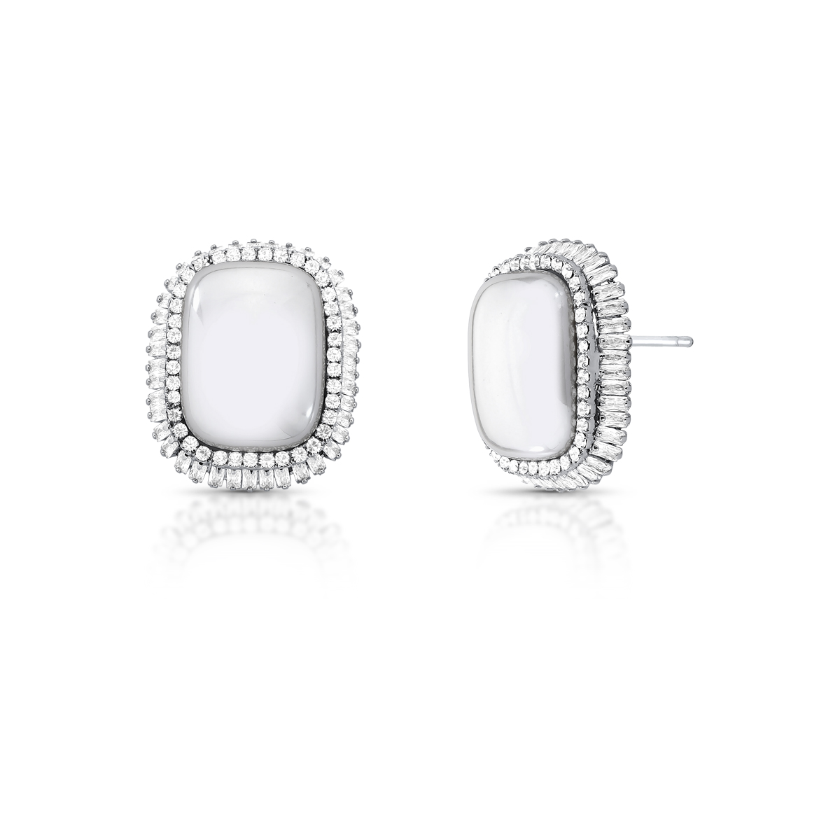 Brinco semijoia banho ródio. Modelo bottom. Pérola shell retangular com contorno “bordado” em zircônias cravejadas e baguetes. Niquel free