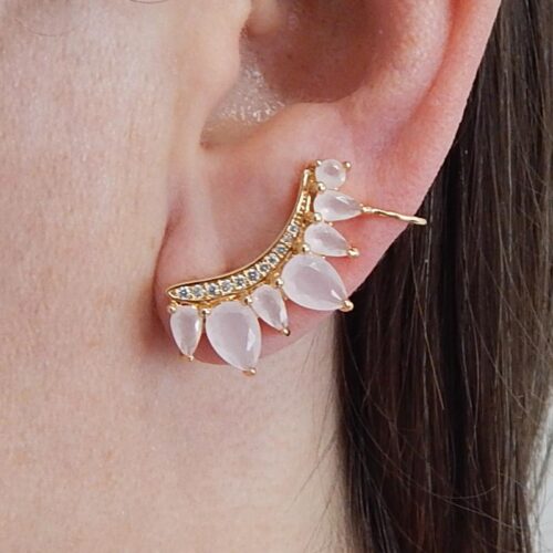 Brinco semi joia. Modelo ear cuff curvo, anatômico, 7 gotas em zircônias e filete cravejado. Ajuste gancho lateral.