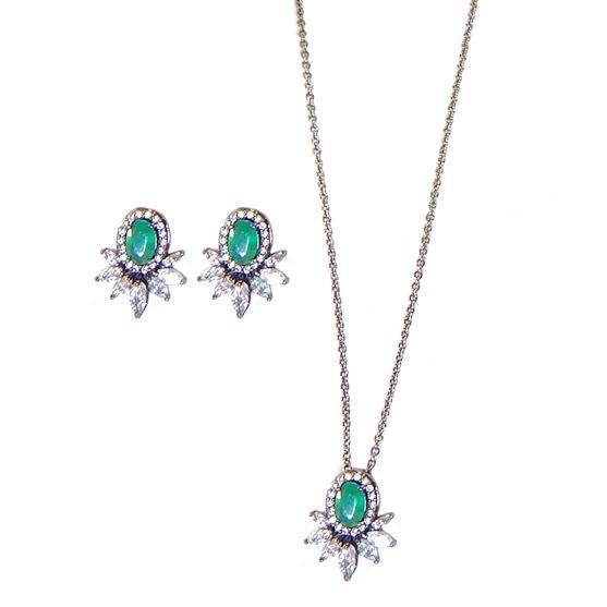 Brinco semi joia banho ródio negro. Zircônia verde esmeralda oval, contorno cravejado e 3 navetes.
