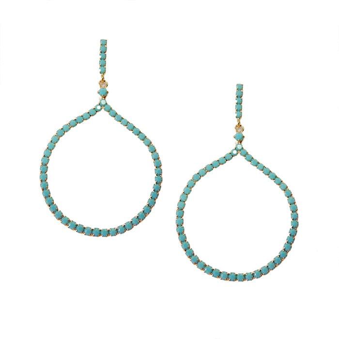 Brinco semi joia. Todo em strass turquesa. Base tipo palito. Gota grande.