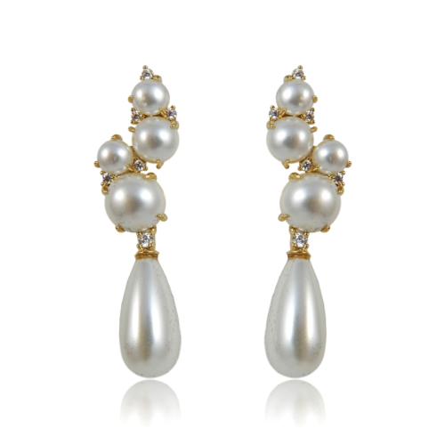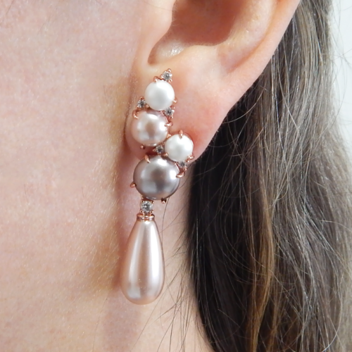 Brinco semi joia. Base cacho pérolas sintéticas (champagne ou negras) e pontos de luz. Gota média também em pérola sintética