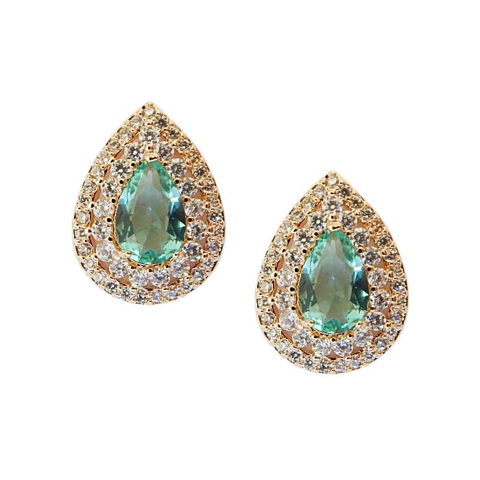 Brinco semi joia banho ouro 18k. Gota em zircônia facetada cor acqua, contorno duplo cravado em micro zircônia cristal.