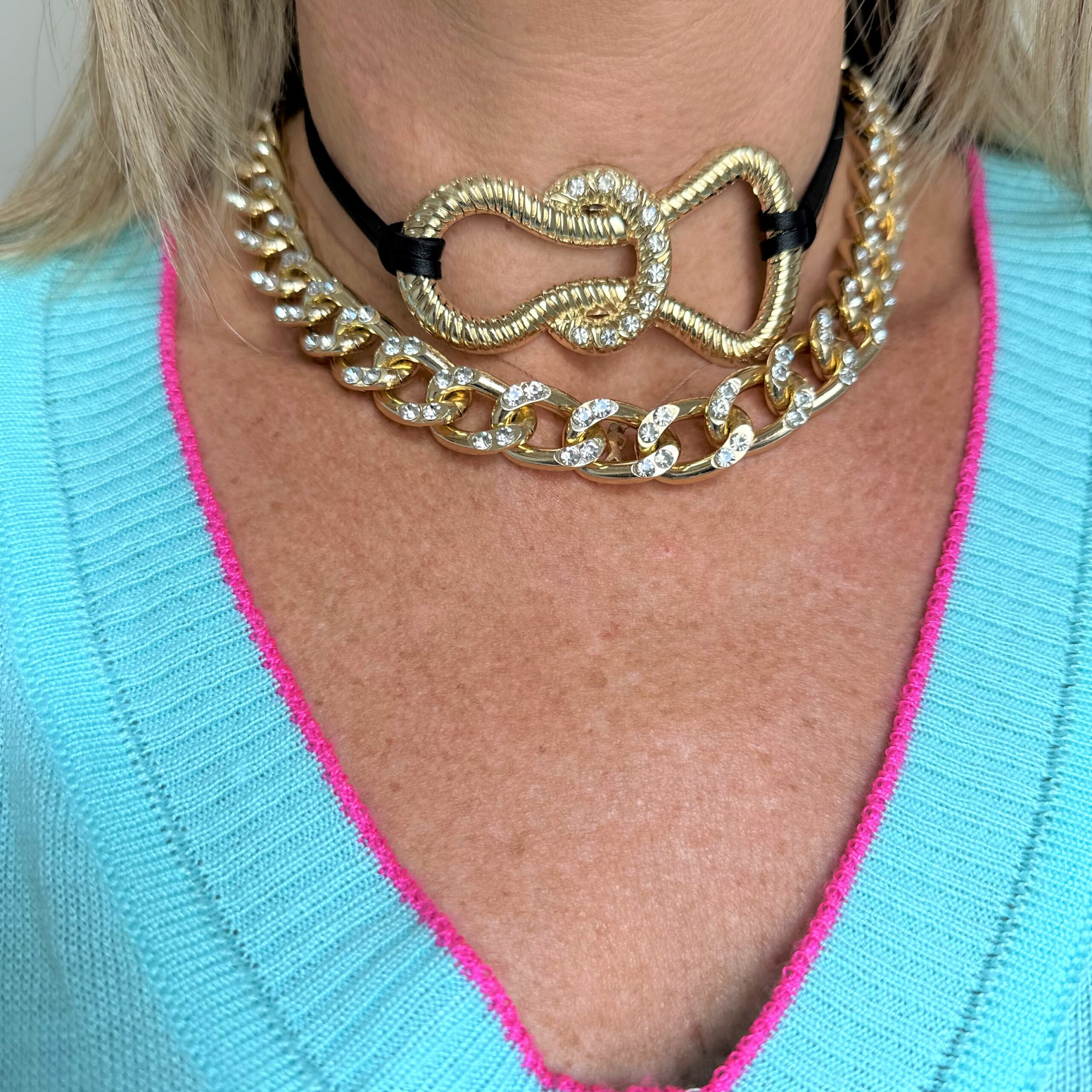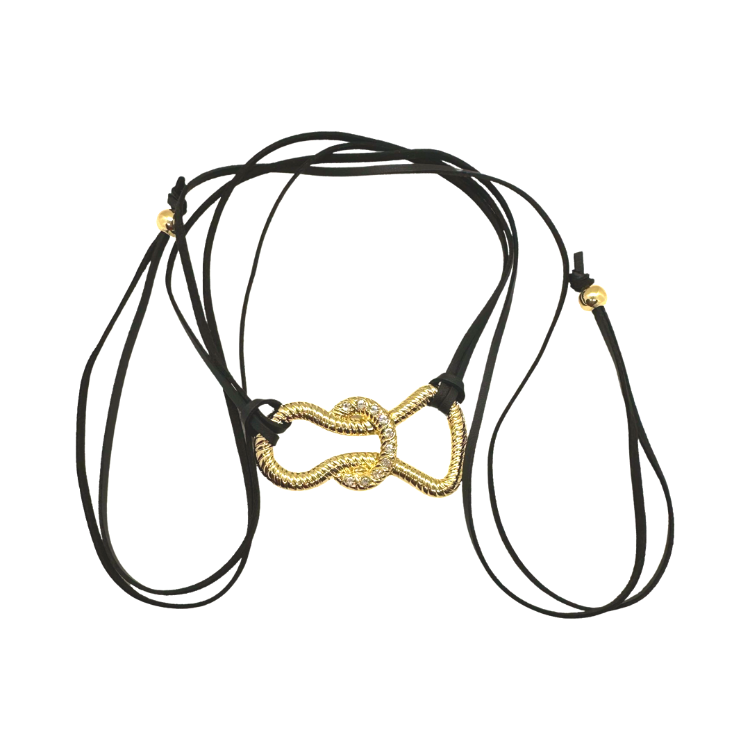 Colar bijuteria banho dourado. Fio em couro duplo, com ponteiras. Pingente bridão de nó trabalhado ao centro com strass. Várias formas de amarração até mesmo como cinto