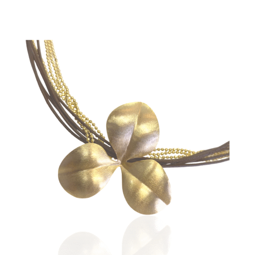 Colar semijoia banho ouro 18k. Modelo choker. 4 fios corrente diamantada e 5 fios de couro redondo encerado na cor tabaco. Fecho magnético. Pingente flor em banho ouro fosco. Niquel free