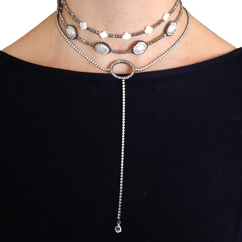 Colar semi joia banho ródio negro. Modelo choker toda em zircônias, círculo central cravejado e gravata com ponto de luz.
