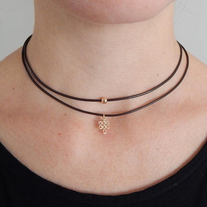 Colar em cordão fio duplo, encerado, terminais e pingentes em banho ouro 18k. Modelo choker.