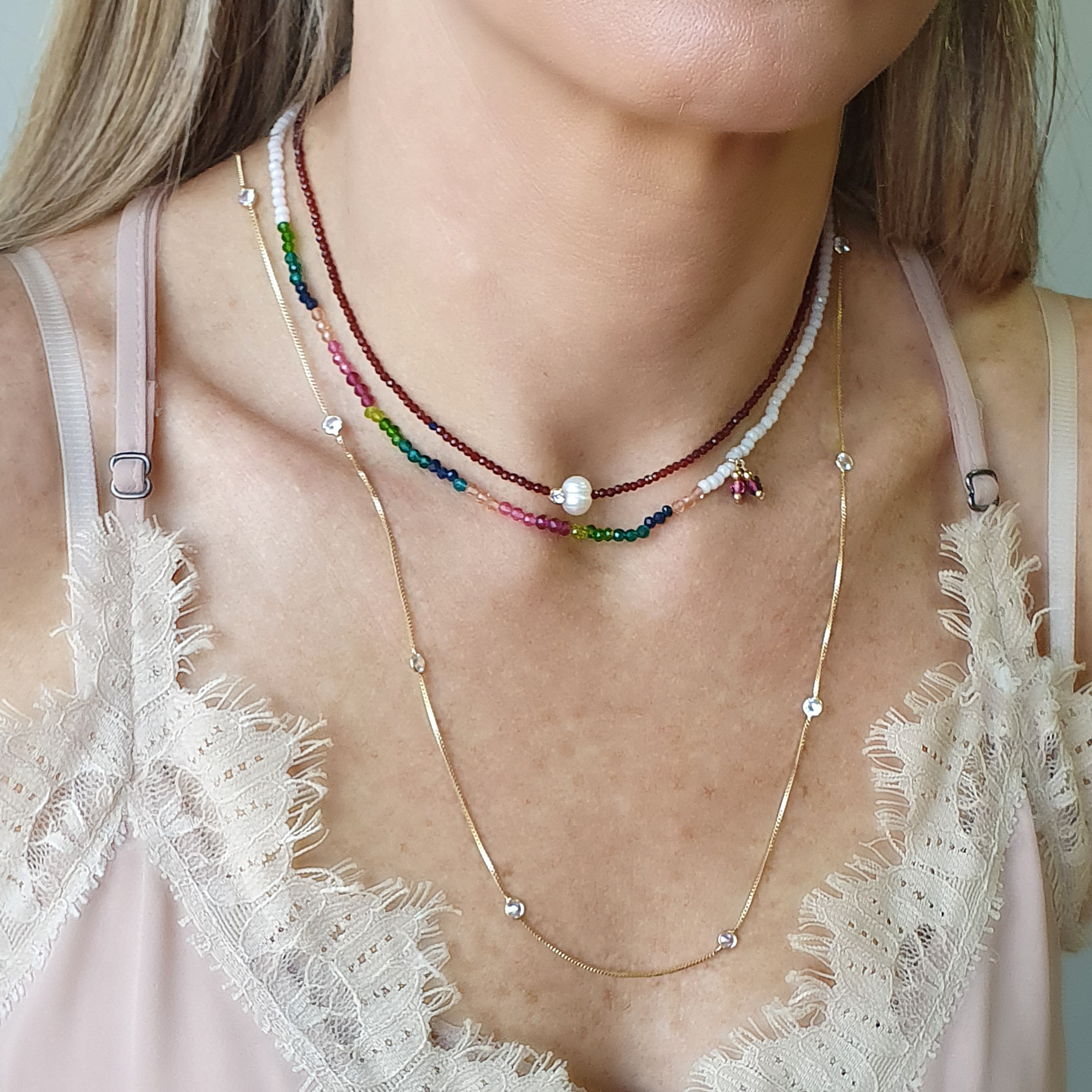 Colar semi jóia banho ouro 18k. Modelo choker, toda em mini zircônias facetadas, cor granada. Pérola biwa ao centro e um ponto de luz. Niquel free