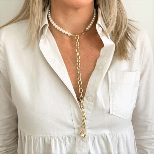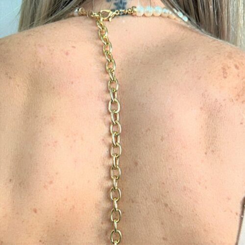 Colar bijuteria dourada. Modelo choker em pérolas sintéticas. Extensor corrente elos ovais com pingente pérola na extremidade