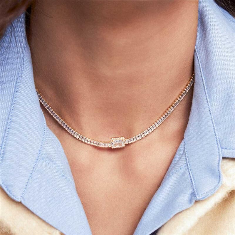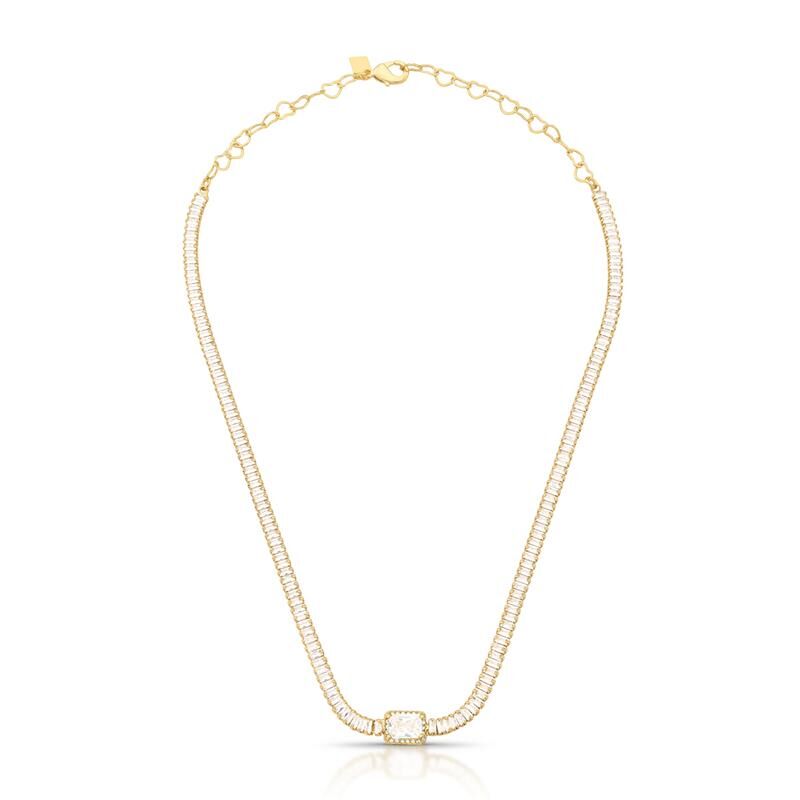 Colar semijoia banho ouro 18k. Modelo choker, toda em zircônias baguetes e ponto de luz retangular com contorno cravejado. Niquel free.