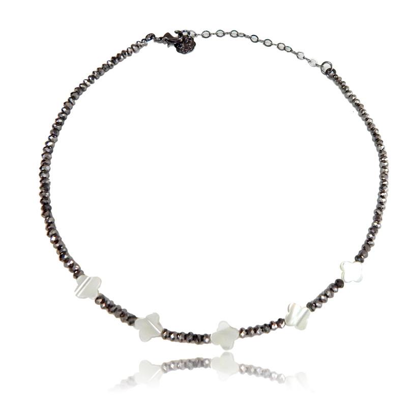 Colar no fio de hematitas, banho ródio negro. Modelo choker, 5 trevos de madrepérolas.