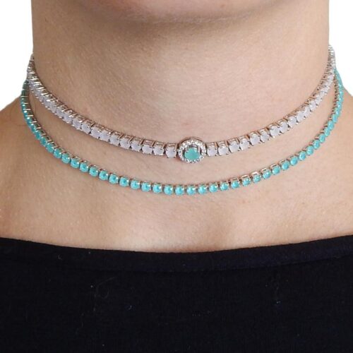 Colar semi joia banho ródio. Modelo choker tipo riviera 1/2 fio em zircônias rosa opaco, 1/2 fio corrente. Centro em zircônia acqua com contorno cravejado em micro zircônia cristal.