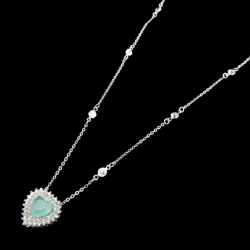Colar semi joia banho ródio. Corrente com pontos de luz – modelo Tiffany – e pingente fixo coração zircônia acqua lapidada com duplo contorno cravejado. Galeria.