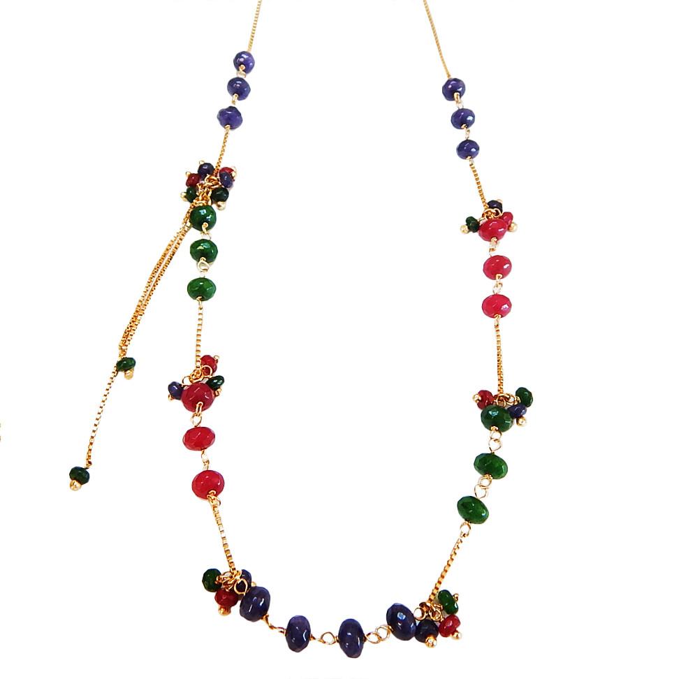 Colar semi joia banho ouro 18k. Corrente veneziana com jades: rubi, safira e esmeralda e franja lateral com cacho pedras.